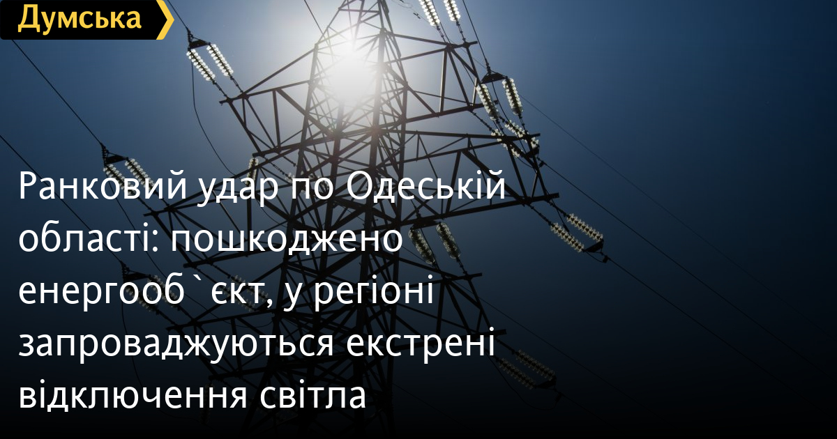 Енергооб'єкт в Одеській області зазнав пошкоджень внаслідок ранкового удару окупантів по регіону.
