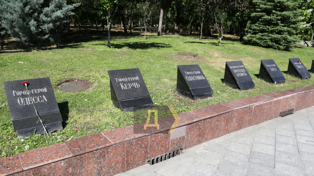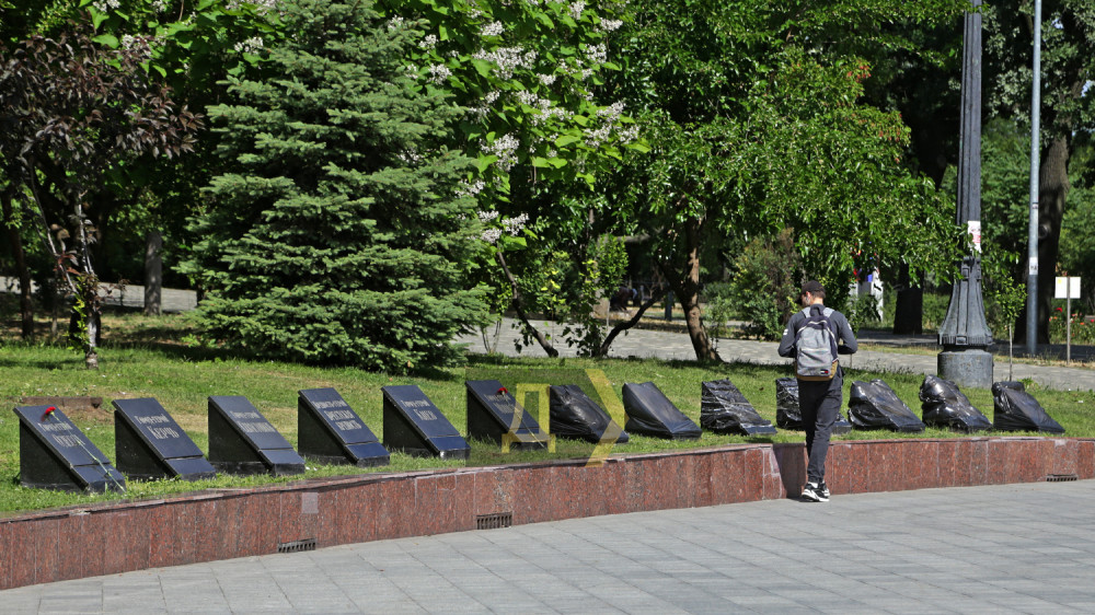 Стоящие неподалеку таблички с названиями российских городов-героев по-прежнему закрыты черной пленкой.