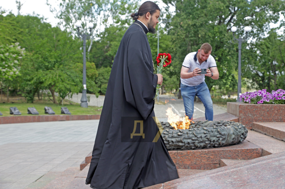 Иногда одесситы приносят к вечному огню цветы. Священник московского патриархата пришел с букетом и даже решил запечатлеть это событие на видео, но в момент возложения предательски завыла сирена воздушной тревоги.