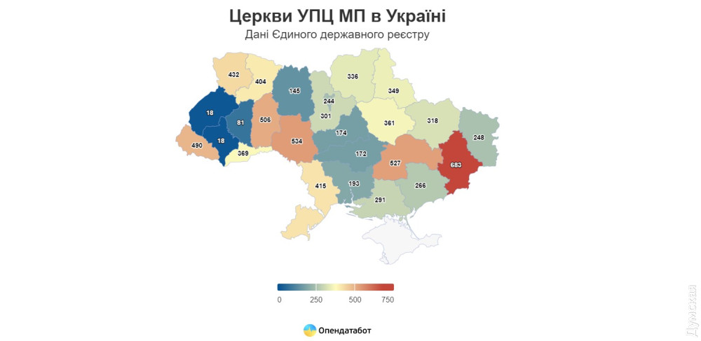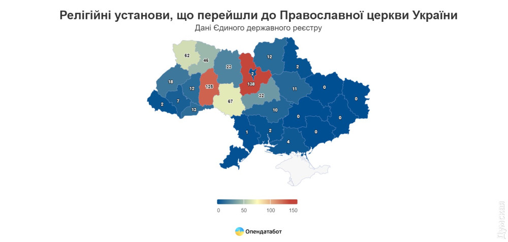 Як свідчать дані платформи «Опендатабот», менше, тобто жодної церкви, лише у фронтових, прифронтових або окупованих Запорізькій, Дніпропетровській, Харківській та Донецькій областях.
