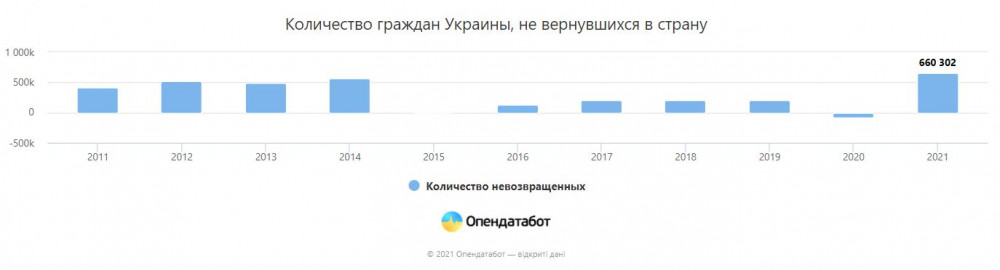 «Коронавирусный 2020-й — единственный год, когда украинцев, вернувшихся домой, было больше, чем выехавших», — уточняют в сервисе. Год назад украинцев, вернувшихся домой, было на 80 тысяч больше, чем выехавших.
