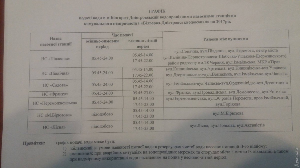 С 30 мая в Белгороде-Днестровском перешли к подаче воды потребителям по графику. Как сообщили в мэрии, это связано с увеличением водопотребления, а также с тем, что водоканал накопил долги за электроэнергию и ему ограничили ее подачу. Большинство жителей города получает воду с дневным (14-17:45) и ночным перерывами. Весь день снабжают водой только абонентов насосной станции «Франко», но и у них краны пересыхают по ночам. Перерывы могут увеличиться при чрезмерном использовании воды для полива огородов и садов, предупреждают в муниципалитете. СМЕРТЬ РОСІЙСЬКИМ ОКУПАНТАМ! Помітили помилку? Виділяйте слова з помилкою та натискайте control-enter |