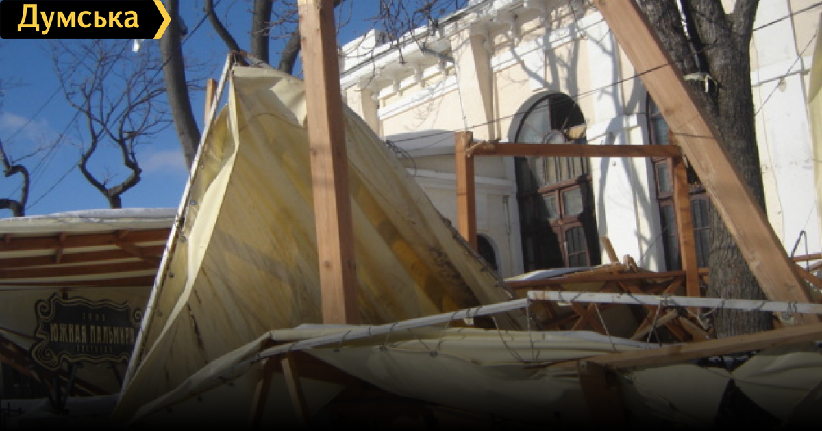Это ж когдато в прошлом Модный ресторан южная Пальмира, памятник архитектуры! понастраивали из досок навесы для летней балежки и брезентом накрыли, естественно что оно порвалось..