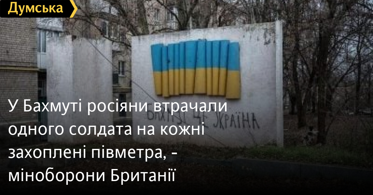 «У лютому 2022 року росія, ймовірно, планувала завершити захоплення всього Донбасу протягом 10-14 днів. Але в Бахмуті на кожні 48 см здобутих позицій припадає один загиблий або поранений. Україна бореться далі», — повідомляє Міноборони Британії у Твіттері.