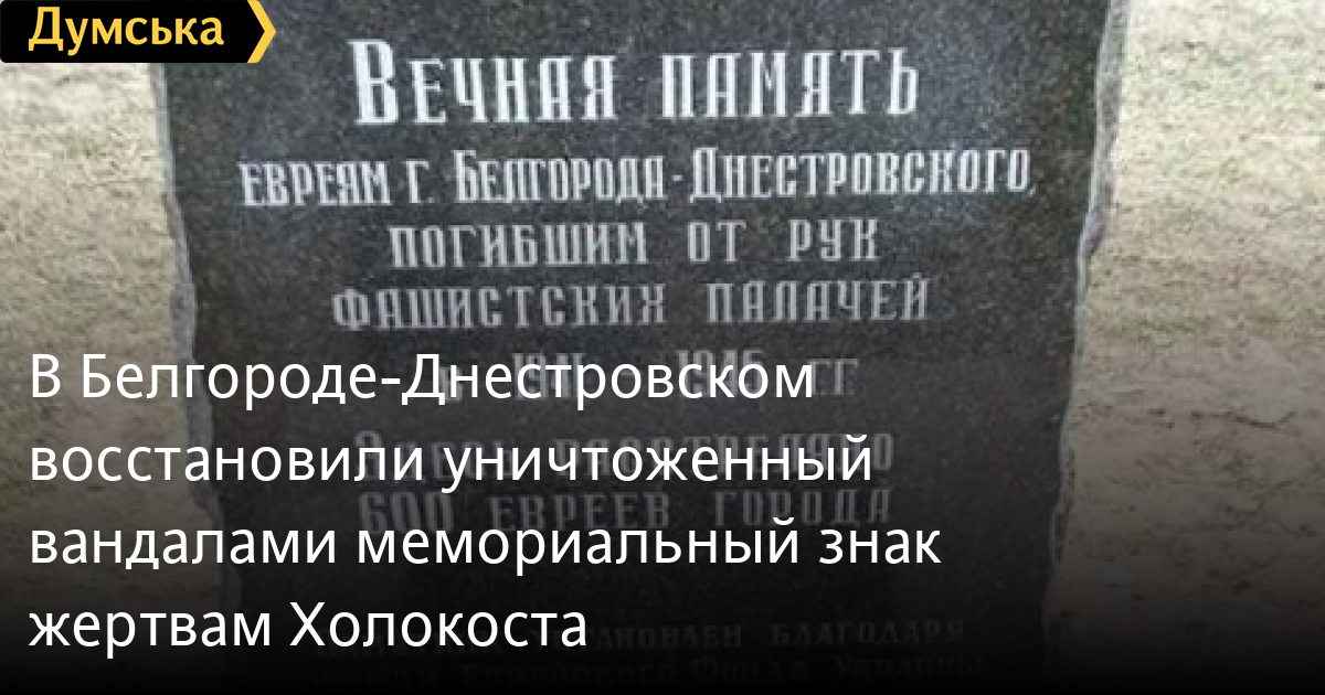 В Белгороде-Днестровском восстановили уничтоженный вандалами мемориальный знак жертвам ХолокостаНакануне Международного дня памяти жертв Холокоста, который отмечается 27 января, в Белгороде-Днестровском Одесской области восстановили памятный знак, разрушенный вандалами неделю назад. Как сообщили в Белгород-Днестровском горсовете, 26 января коммунальщики вернули на прежнее место отреставрированную плиту, установленную на месте расстрела 600 евреев. Поисками хулиганов, разрушивших памятный знак, занимается полиция. СМЕРТЬ РОССИЙСКИМ ОККУПАНТАМ! Заметили ошибку? Выделяйте слова с ошибкой и нажимайте control-enter |