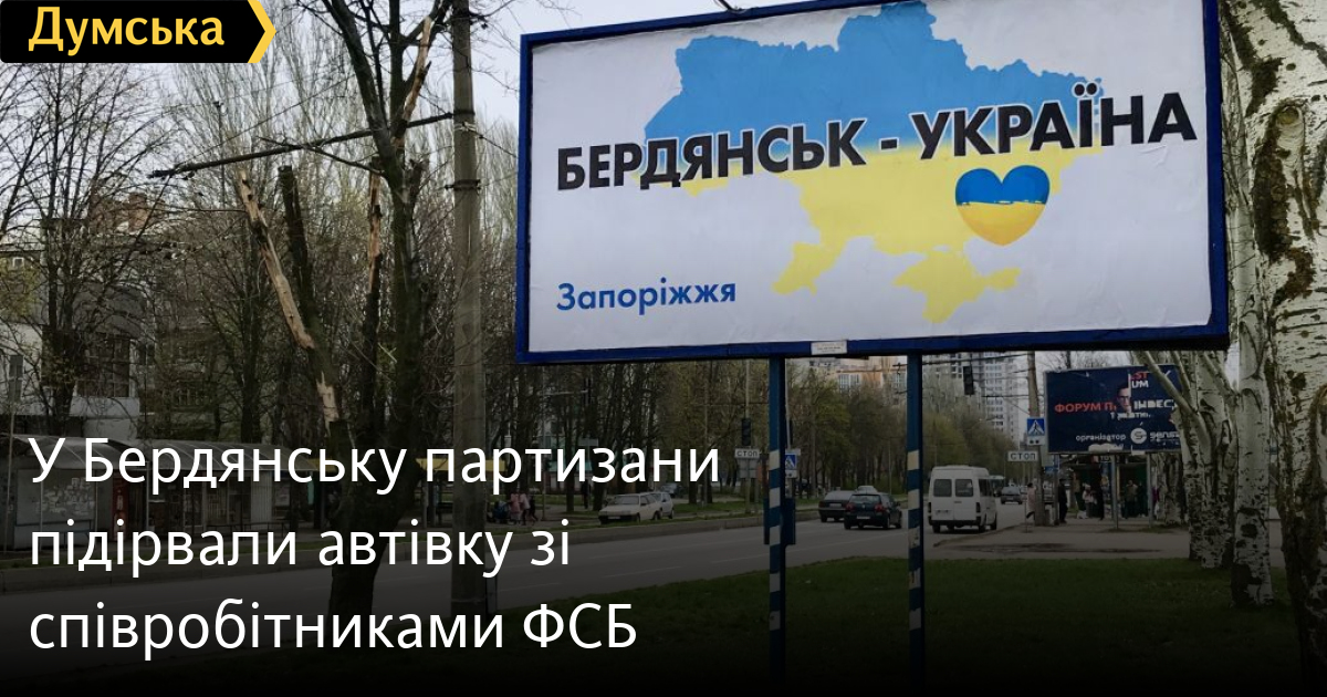 У Бердянську партизани підірвали автівку зі співробітниками ФСБВ тимчасово окупованому Бердянську Запорізької області підірвали автомобіль, в якому перебували четверо представників російської федеральної служби безпеки. Як повідомили в Головному управлінні розвідки Міноборони, акцію помсти представники українського руху опору здійснили 23 жовтня поблизу готелю Jasmin Guest-House, який фсб-шники перетворили на свою схованку. Серед ліквідованих у Бердянську окупантів ― російський воєнний злочинець, який вчиняв звірські катування українців. Після підриву авто гауляйтер тимчасово окупованих територій Запорізької області розпорядився збільшити комендантську годину з 21:00 до 5:00 з 1 листопада, а представники російських спецслужб негайно покинули готель та перебазувались. СМЕРТЬ РОСІЙСЬКИМ ОКУПАНТАМ! Помітили помилку? Виділяйте слова з помилкою та натискайте control-enter |