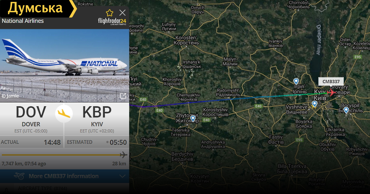 В столичном аэропорту «Борисполь» ночью приземлились очередные два борта с американскими военными грузами. Как сообщает корреспондент «Думской», первый Boeing-747-412 (BCE) зашел на посадку в 3:35 ночи, второй аналогичный «грузовик» приземлился в 5:50. Оба самолета авиакомпании National Airlines прибыли в Киев из города Довер, штат Дэлавер. Что в этот раз союзники привезли украинской армии — пока неизвестно. СМЕРТЬ РОСІЙСЬКИМ ОКУПАНТАМ! Помітили помилку? Виділяйте слова з помилкою та натискайте control-enter |