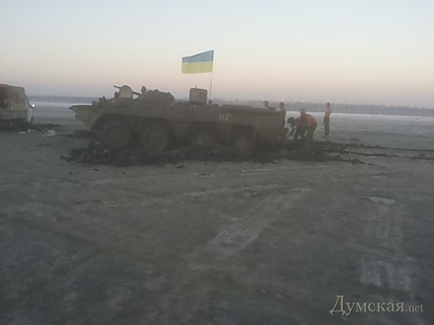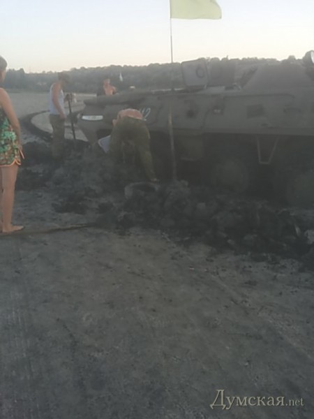 Бронетранспортер украинских Вооруженных сил застрял в лечебных грязях Куяльника. К настоящему времени БТР уже вытянули из природной ловушки.