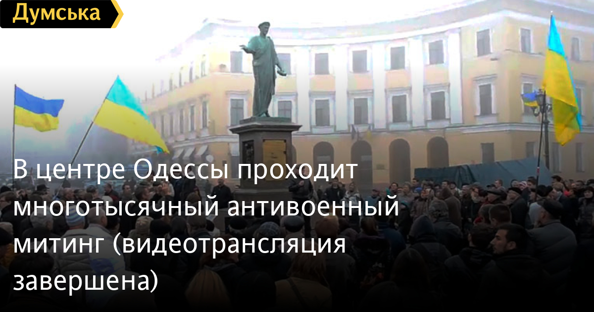 В воскресенье на Приморском бульваре прошел многотысячный митинг одесситов, протестующих против вмешательства вооруженных сил других государств в события в Украине. Одесситы скандировали: «Крым — Украина», «Путин геть», «Нет войне!».