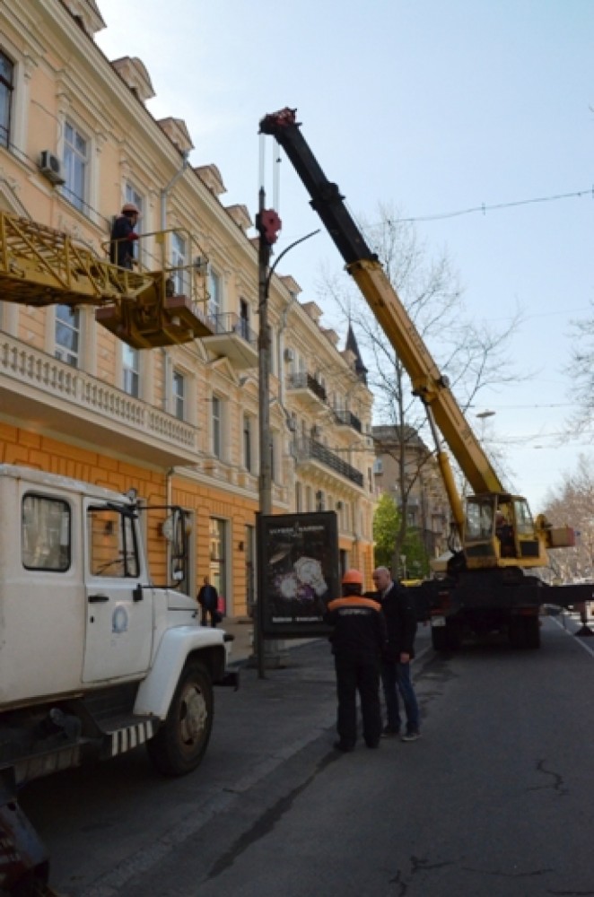 «В целях безопасности горожан сотрудники предприятия регулярно проверяют состояние опор на предмет аварийности. На сегодняшний день преимущественно в центральной части Одессы еще есть опоры наружного освещения, возраст которых превышает 100 лет. Аварийные опоры демонтируются, а на их место впоследствии будут установлены новые, — говорится в сообщении. Столбы демонтируют с помощью спецтехники — ЗИЛа, крана и вышки. Кроме того, по данным мэрии, в период с 16 по 22 апреля текущего года «Одесгорсвет» выполнил ремонт 45 воздушных и кабельных линий наружного освещения, 40 трансформаторных подстанций и 10 исполнительных пунктов, так называемых «шкафов».