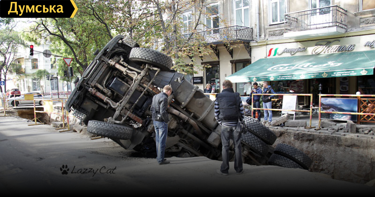В центре Одессы грузовик упал в огромную яму