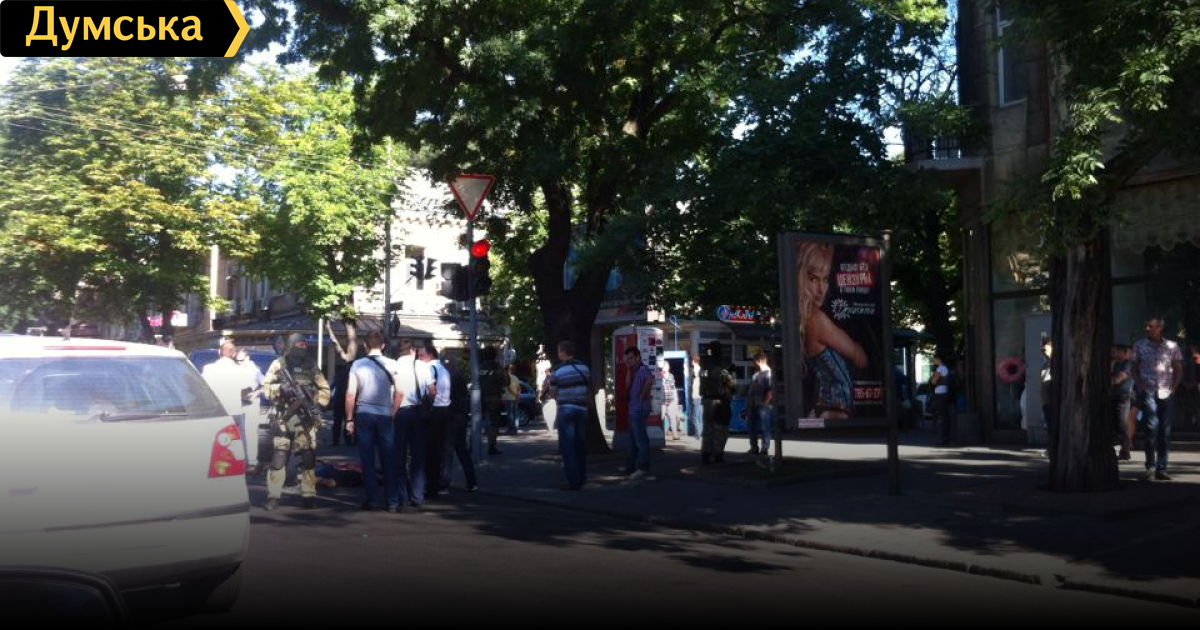 На указанном перекрестке образовалась пробка, по улице Жуковского припаркованы два автомобиля в направлении движения транспорта – синий минивэн и бежевая легковушка, у обочины силовики положили на асфальт троих парней худощавого телосложения с татуировками, пишет «Одесса-медиа». По данным некоторых очевидцев, на асфальте видна кровь.