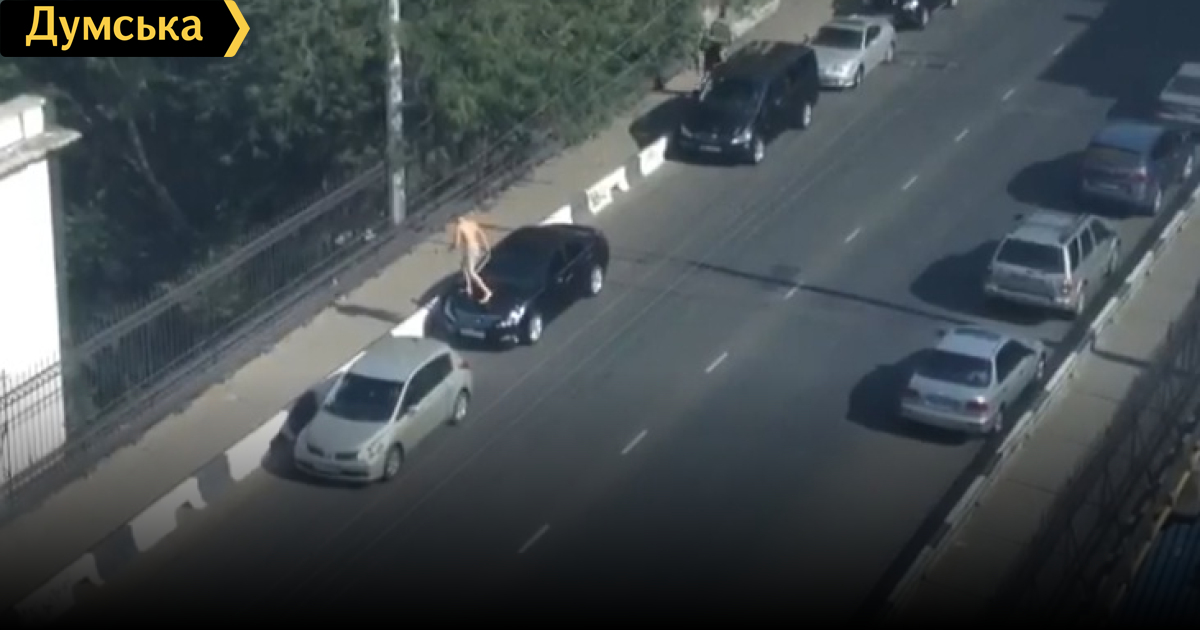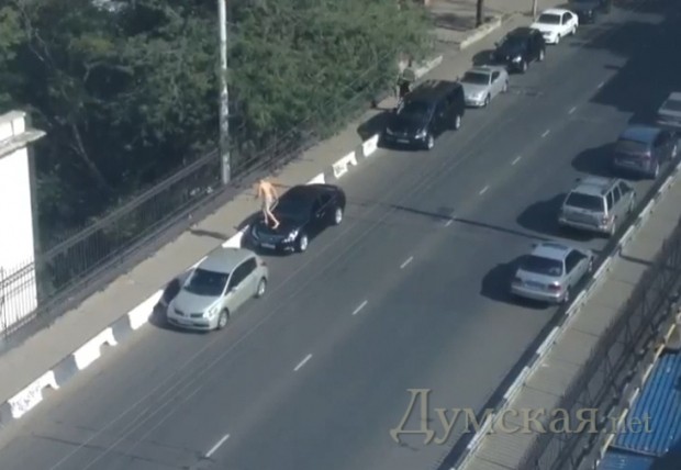 Тамщем-та пришел он не с Канатной, вот нафига писать что-то лишь бы написать? Пришел из центра по Греческой. Шел, орал что-то. Потом запрыгнул на серый Ниссан, на крыше хорошая такая вмятина осталась. Слез, потолкал микроавтобус чёрный, попылся его за бампер поднять, прошелся ещё вперёд, вернулся и через вот эту черную машину, кстати, номера не одесские у неё, перешел. И пошел в центр по пути таки потеряв трусы.