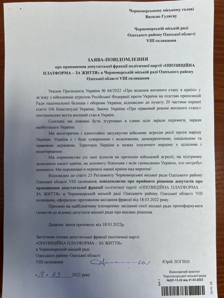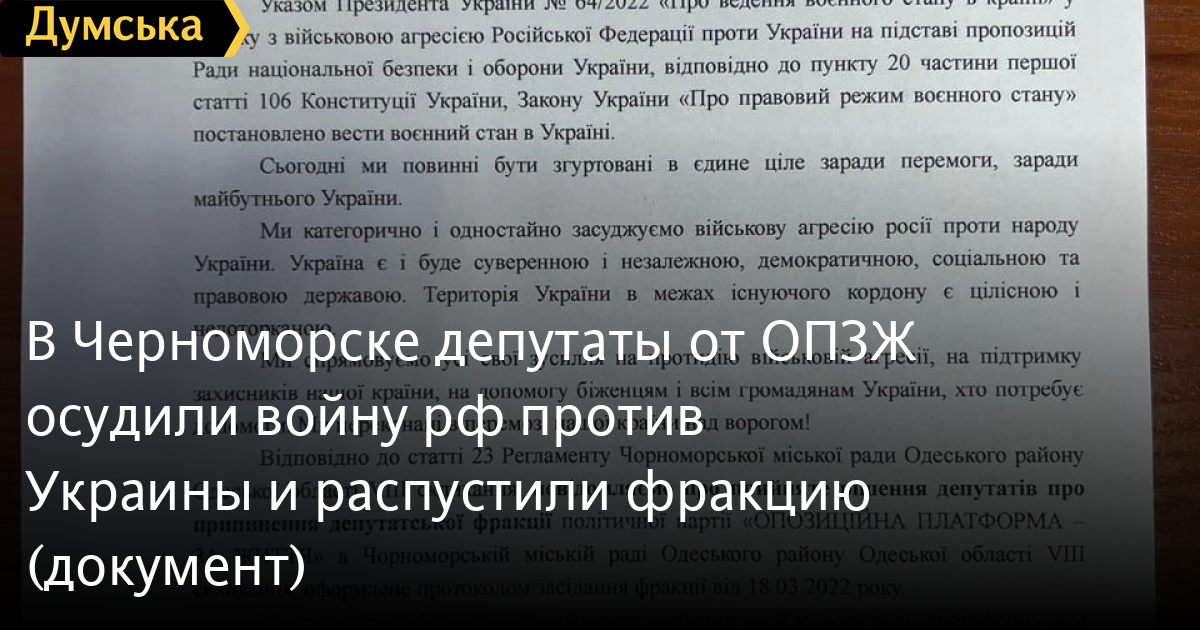 Депутаты Черноморского городского совета Одесской области от ОПЗЖ публично осудили войну, развязанную нацистской РФ против Украины, и распустили свою фракцию.