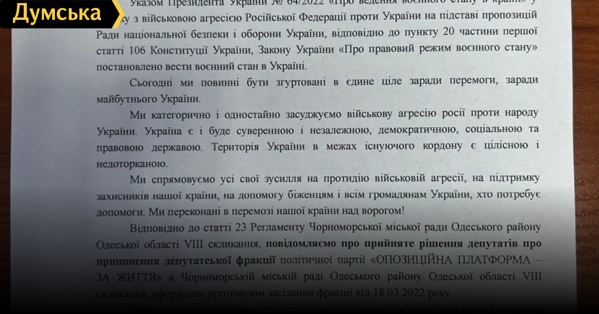 В Черноморске депутаты от ОПЗЖ осудили войну рф против Украины и распустили фракцию (документ)Депутаты Черноморского городского совета Одесской области от ОПЗЖ публично осудили войну, развязанную нацистской РФ против Украины, и распустили свою фракцию. Об этом говорится в заявлении депутатского объединения. «Сегодня мы должны быть объединены в единое целое ради победы, ради будущего Украины. Мы категорически и единогласно осуждаем военную агрессию россии против народа Украины. Украина есть и будет суверенным и независимым, демократическим, социальным и правовым государством. Территория Украины в пределах существующей границы является целостной и неприкосновенной. Мы направляем все свои усилия на противодействие военной агрессии, на поддержку защитников нашей страны, на помощь беженцам и всем гражданам, которые нуждаются в помощи. Мы убеждены в победе нашей страны над врагом!» — отметили депутаты. Напомним, вчера Президент Украины, Верховный главнокомандующий ВС Украины Владимир Зеленский своим указом ввел в действие решение СНБОУ о приостановке на время военного положения деятельности партий ОПЗЖ, «Партия Шария», «Оппозиционный блок», «Наши», «Социалистическая партия», «Союз левых сил», «Прогрессивная социалистическая партия», «Левая оппозиция», «Держава», «Партия социалистов», «Блок Владимира Сальдо». СМЕРТЬ РОСІЙСЬКИМ ОКУПАНТАМ! Помітили помилку? Виділяйте слова з помилкою та натискайте control-enter |