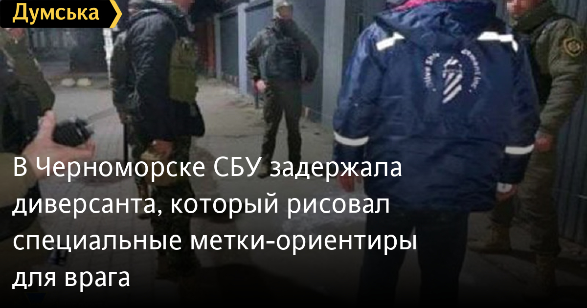В Черноморске СБУ задержала диверсанта, который рисовал специальные метки-ориентиры для врагаВ Черноморске Одесской области СБУ задержала пророссийского диверсанта, который рисовал специальные метки-ориентиры для врага. Об этом сообщают в пресс-службе областного управления СБУ. Если вы заметили таких подозрительных лиц – звоните по телефону 102 или в СБУ по номеру 0 800 501 482. По возможности организуйте их гражданское задержание. Если вы увидели метки (крест, круг и т. д.), нанесенные люминесцентной или светоотражающей краской, определите место, где они находятся. Укажите: 🔸 название населенного пункта, где именно находится знак 🔸 если метка – на трассе, то укажите расстояние от населенного пункта, или другие ориентиры. Закрасьте, засыпьте или другим способом уничтожьте отметку. Это может быть система сигналов, использующих врагом для координации вторжения. СМЕРТЬ РОССИЙСКИМ ОККУПАНТАМ! Заметили ошибку? Выделяйте слова с ошибкой и нажимайте control-enter |