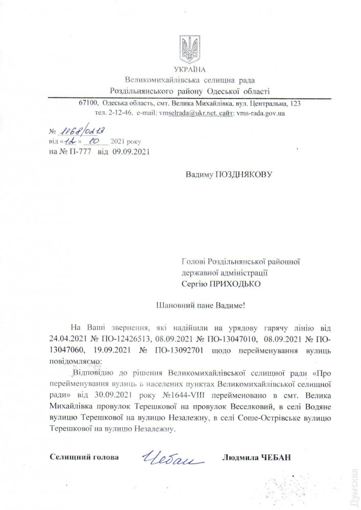 По решению Великомихайловского поселкового совета переулок Терешковой в пгт Великая Михайловка стал Радужным переулком, в селах Водяное и Соше-Островское две улицы стали Независимыми.