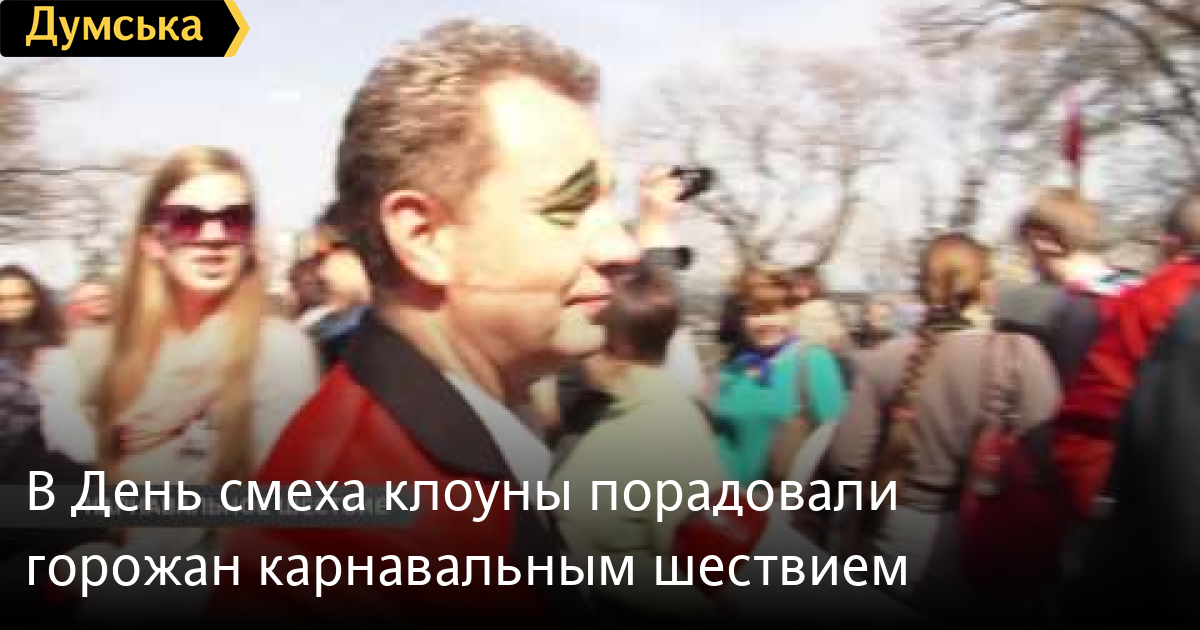 В День смеха клоуны порадовали горожан карнавальным шествием. Кроме знаменитых одесских, нас посетили артисты из Армении, Бразилии, Германии, Чили, Швейцарии и Израиля. Завершился веселый марш награждением победителя. Кто стал самым лучшим клоуном – 2016. знает Ксения Терзи. СМЕРТЬ РОССИЙСКИМ ОККУПАНТАМ! Заметили ошибку? Выделяйте слова с ошибкой и нажимайте control-enter Думская ТВ. Сюжеты: