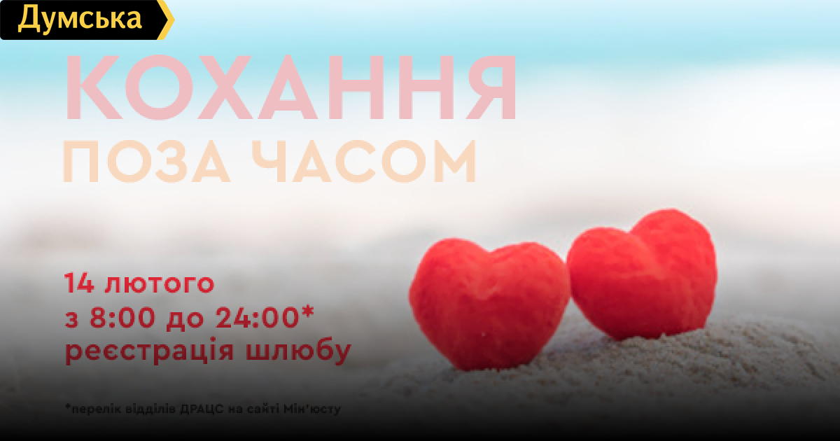 Одесские и черноморские отделы государственной регистрации актов гражданского состояния (РАГС) присоединились к акции «Любовь вне времени» и в День всех влюбленных 14 февраля будут работать до полуночи. Об этом сообщили в пресс-службе облуправления юстиции. В Одессе до 24:00 можно будет расписаться в Приморском РАГСе на Разумовской, 37 и Суворовском на Десантном бульваре, 14, в Черноморске влюбленных ждет городской отдел по адресу улица Данченко, 3б. СМЕРТЬ РОСІЙСЬКИМ ОКУПАНТАМ! Помітили помилку? Виділяйте слова з помилкою та натискайте control-enter |