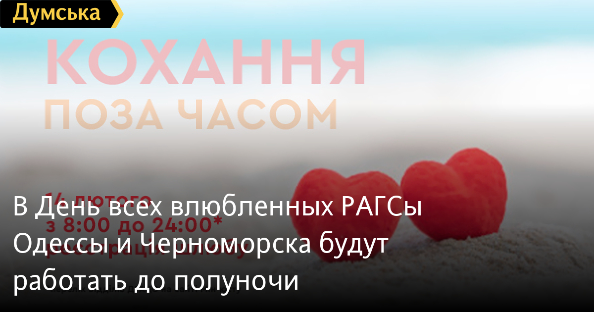 Одесские и черноморские отделы государственной регистрации актов гражданского состояния (РАГС) присоединились к акции «Любовь вне времени» и в День всех влюбленных 14 февраля будут работать до полуночи. Об этом сообщили в пресс-службе облуправления юстиции. В Одессе до 24:00 можно будет расписаться в Приморском РАГСе на Разумовской, 37 и Суворовском на Десантном бульваре, 14, в Черноморске влюбленных ждет городской отдел по адресу улица Данченко, 3б. СМЕРТЬ РОСІЙСЬКИМ ОКУПАНТАМ! Помітили помилку? Виділяйте слова з помилкою та натискайте control-enter |