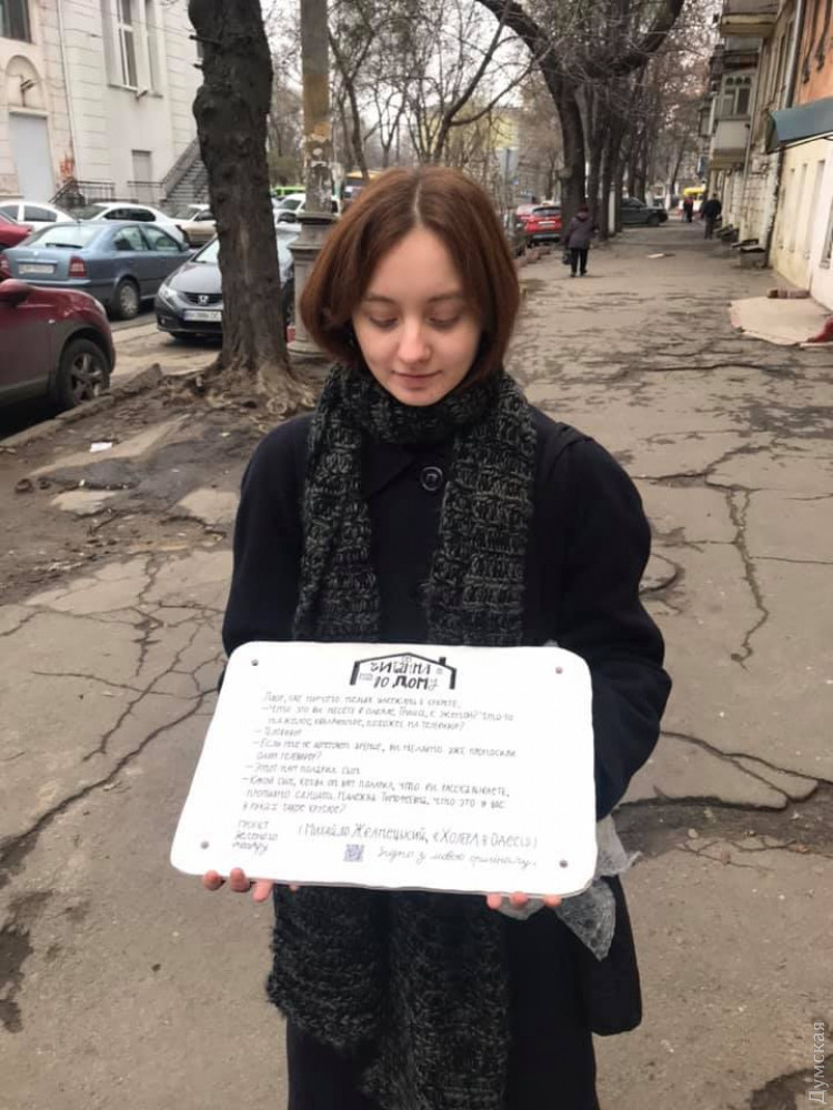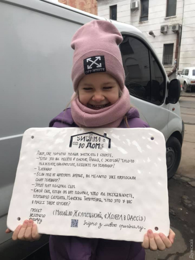 Ранее такие таблички появились на Строгановском мосту (с отрывком из книги Юрия Олеши «Стадион в Одессе»), на территории Зеленого театра (с цитатой Владимира Жаботинского) и на Софиевской, 17 (с отрывком из «Одесских рассказов Исаака Бабеля).