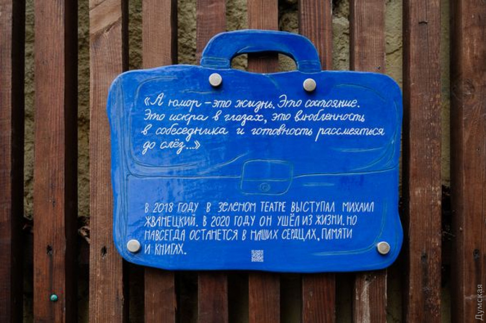 Еще одна доска в память о сатирике — в виде его портфеля — теперь висит у входа в «Зеленый театр». На ней - известное высказывание Жванецкого: «А юмор — это жизнь. Это состояние. Это не шутки. Это искры в глазах. Это влюбленность в собеседника и готовность рассмеяться до слез».