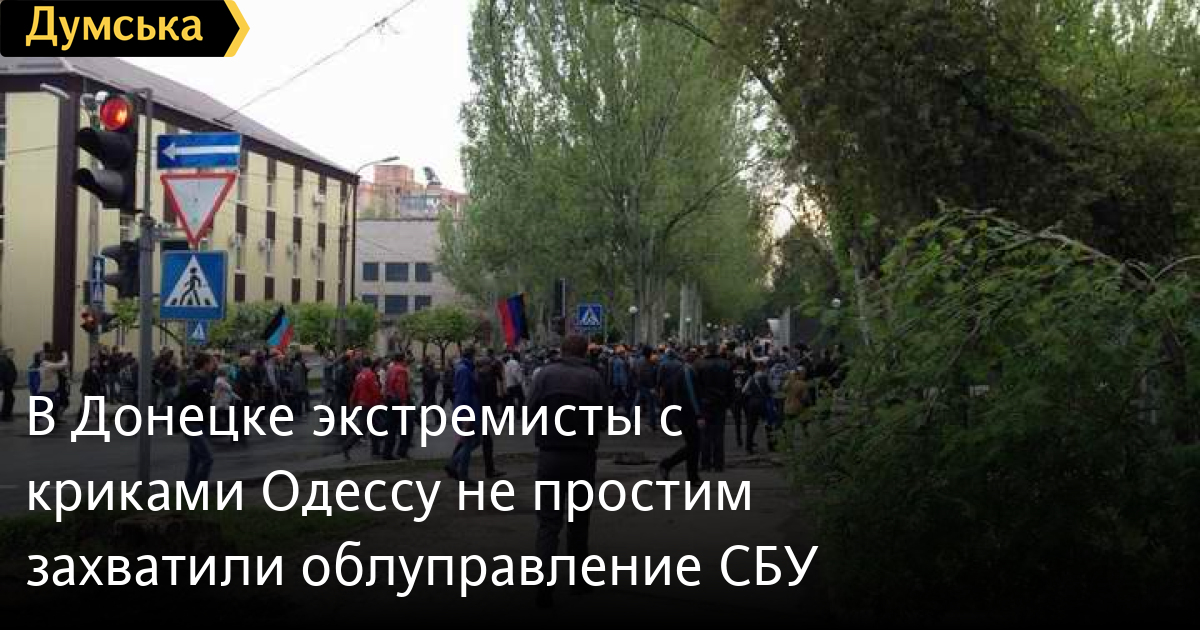 Сторонники самопровозглашенной «Донецкой народной республики» за несколько минут взяли штурмом здание управления СБУ в Донецкой области. Люди, многие из которых одеты в камуфляжную форму, вооружены битами, дубинками и арматурой. Они скандируют «Россия!», «Одесса – русский город» и «Одессу не простим!», пишет «ОстроВ». Штурм длился немногим более двух минут: разбив окна, толпа ворвалась в здание, которое никто не охранял. Также молниеносно протестующие захватили здание следственного управления СБУ, находящееся рядом. Всего в акции принимает участие около 1000 человек. На козырьке захваченного здания управления СБУ водружен флаг «Донецкой народной республики». Ранее у стен захваченной сепаратистами областной государственной администрации прошел митинг в память о погибших 2 мая в Одессе. СМЕРТЬ РОССИЙСКИМ ОККУПАНТАМ! Заметили ошибку? Выделяйте слова с ошибкой и нажимайте control-enter |