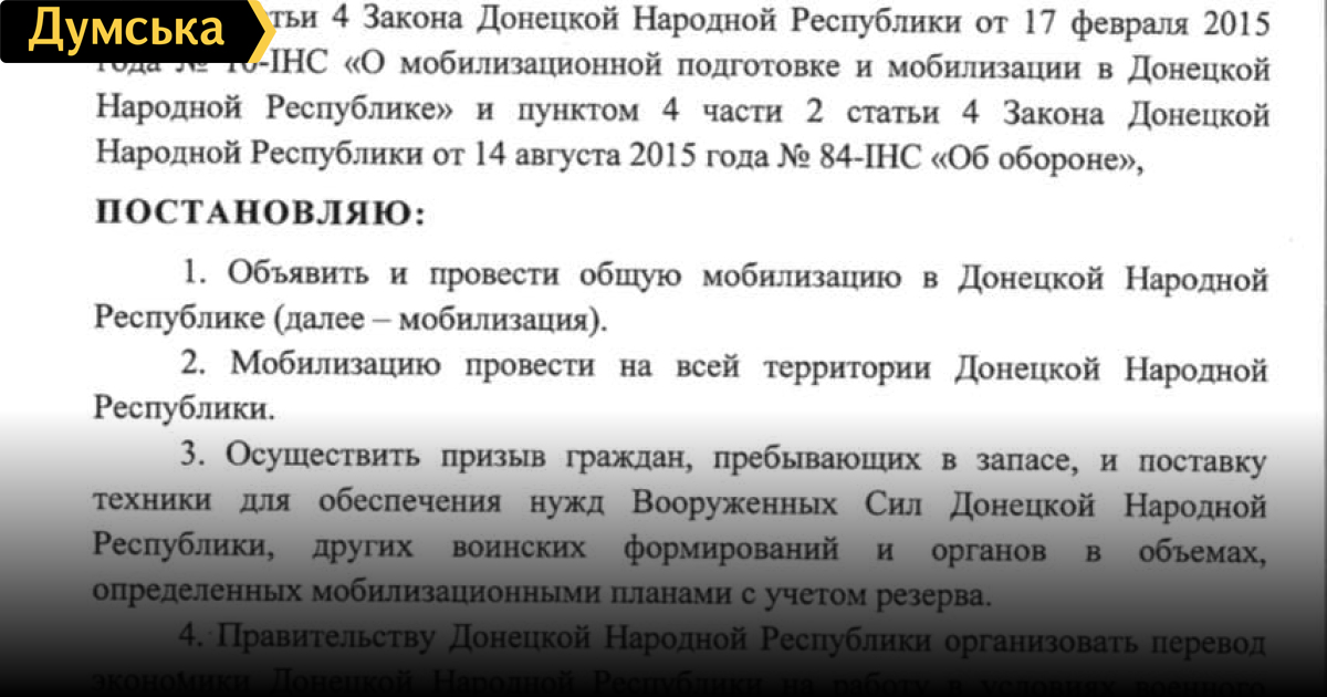 Так называемые указы о проведении всеобщей мобилизации объявили главари террористических организаций «ДНР» и «ЛНР» на оккупированных территориях Донбасса. Поводом для этого послужила воображаемая угроза наступления Вооруженных сил Украины. В «документах», которые обнародовали ряд средств массовой информации, террористы призывают граждан, пребывающих в запасе, а также требуют поставить технику для обеспечения нужд самопровозглашенных республик. Предписано также организовать перевод экономики на работу в условиях военного времени. ОБНОВЛЕНО в 11:13. Вместе с тем показательная эвакуацией жителей оккупированных регионов Украины терпит неудачу. Корреспондент «Новой газеты» в Ростовской области на своей странице в «Фейсбуке» отмечает, что автобусы с эвакуированными жителями оккупированных регионов Украины стоят в поле, а РФ не готова к приему. «Сотни беженцев с ночи стоят в автобусах в «Красном Десанте» под Таганрогом. Их никто не принимает, дети 12 часов без горячего питания. Туалет — в полях. У грудничков кончается смесь. Ростовская область не готова к приему беженцев. Люди говорят: лучше бы пересидели в подвалах». Фото «Новая газета» ОБНОВЛЕНО в 11:49. Как сообщила пресс-служба Селидовского горсовета, сегодня около 5 часов утра боевики повредили Южный подъем Карловского водохранилища. В 9:00 водоканал останавливает подачу воды до конца ремонтных работ. Сколько они будут продолжаться — неизвестно. Остановлена подача воды на четыре фильтровальные станции: Карловскую, Великоанадольскую, Старокрымские №1, №2. Они обеспечивают водоснабжение десятков населенных пунктов Донецкой области на подконтрольной украинским властям территории. ОБНОВЛЕНО в 13:27. Боевики обстреляли КПВВ «Счастье» в Луганской области. Также по данным ГСЧС Украины, приблизительно в 11:35 террористы обстреляли пожарно-спасательную часть №32 города. Личный состав находится в безопасном месте, жертв и пострадавших нет. ОБНОВЛЕНО в 15:15. В пресс-службе оперативно-тактической группировки «Восток» сообщают об очередных провокациях, которые боевики совершают для создания картинки российским пропагандистским СМИ. Сообщается, что российские оккупанты обстреляли собственные позиции из тяжелого вооружения в районе населенного пункта Пикузы Волновахского района Донецкой области. В частности, около 4:00 утра начался обстрел позиций украинских защитников в районе населенного пункта Водяное со стороны села Заиченко. По данным разведки, одновременно с этим были зафиксированы взрывы в районе Пикуз. «Это свидетельствует о том, что оккупационные силы пытаются выдать обстрел своих позиций за ответный огонь наших военных», — сообщает пресс-служба. ОБНОВЛЕНО в 16:08. Боевики российской частной военной компании «Вагнер» прибыли в оккупированный Донецк для осуществления провокаций. Об этом сообщает разведка оперативно-тактической группы «Восток». «В целях осуществления провокаций в Донецк прибыли подразделения «вагнеровцев», которые совместно с российскими спецслужбами должны провести серию террористических актов, а именно подрыв жилых домов», — говорится в сообщении. Основная цель провокаций — обвинить Украину в агрессии для дальнейшей эскалации. Отметим, украинские военные неоднократно заявляли и продолжают заявлять, что не планировали и не планируют никаких 