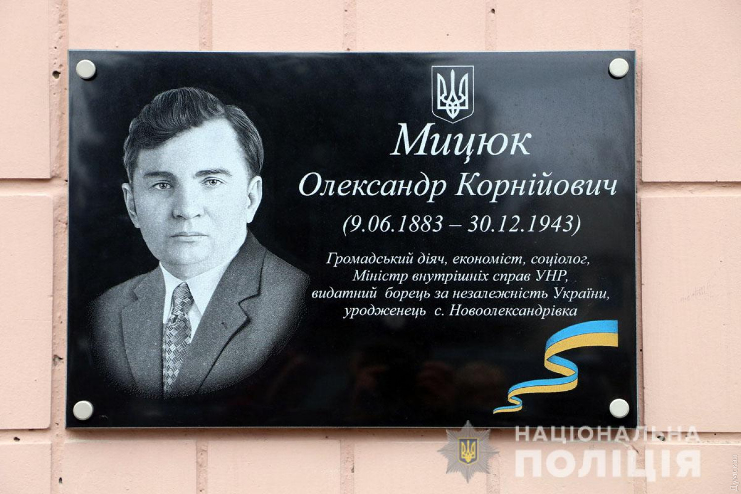 В Донецкой области открыли мемориальную доску первому министру внутренних дел УНРМемориальную доску Александру Мицюку — министру внутренних дел УНР, автору более 60 научных работ и борцу за независимость Украины — открыли в Донецкой области. Как сообщили в отделе коммуникации Нацполиции, мемориальная доска в память о первом министре, занимавшем эту должность в 1918-1919 годах, установлена на здании отделения полиции №1 Краматорского районного управления полиции в его родном поселке Александровка. «Пример Александра Мицюка – это свидетельство того, что украинская душа проявляется и в Донецкой области, и в Закарпатье, и в Одессе, и на территории северных регионов нашего государства, — отметил первый замглавы МВД Евгений Енин. — Из исторических сообщений мы видим, что еще 100 лет назад он ясно осознавал всю сущность московского большевистского режима. Мы должны знать, уважать своих героев и брать пример, потому что главное сражение за независимость еще впереди». По словам председателя ОО «Украинская инициатива» Александра Косенко, корни современных государственных институций были заложены во время первых освободительной борьбы 1917-1921 годов. Среди государственных деятелей того времени есть целая плеяда жителей Донецкой и Луганской областей. Александр Мицюк родился в 1883 году. Политический и государственный деятель являлся соратником многих известных представителей украинской революции. Занимал разные государственные должности, в том числе министра внутренних дел. Известный ученый – юрист, экономист, социолог. Преподавал в нескольких вузах, а также был ректором Украинского свободного университета в Праге. Умер в Чехии. СМЕРТЬ РОСІЙСЬКИМ ОКУПАНТАМ! Помітили помилку? Виділяйте слова з помилкою та натискайте control-enter |