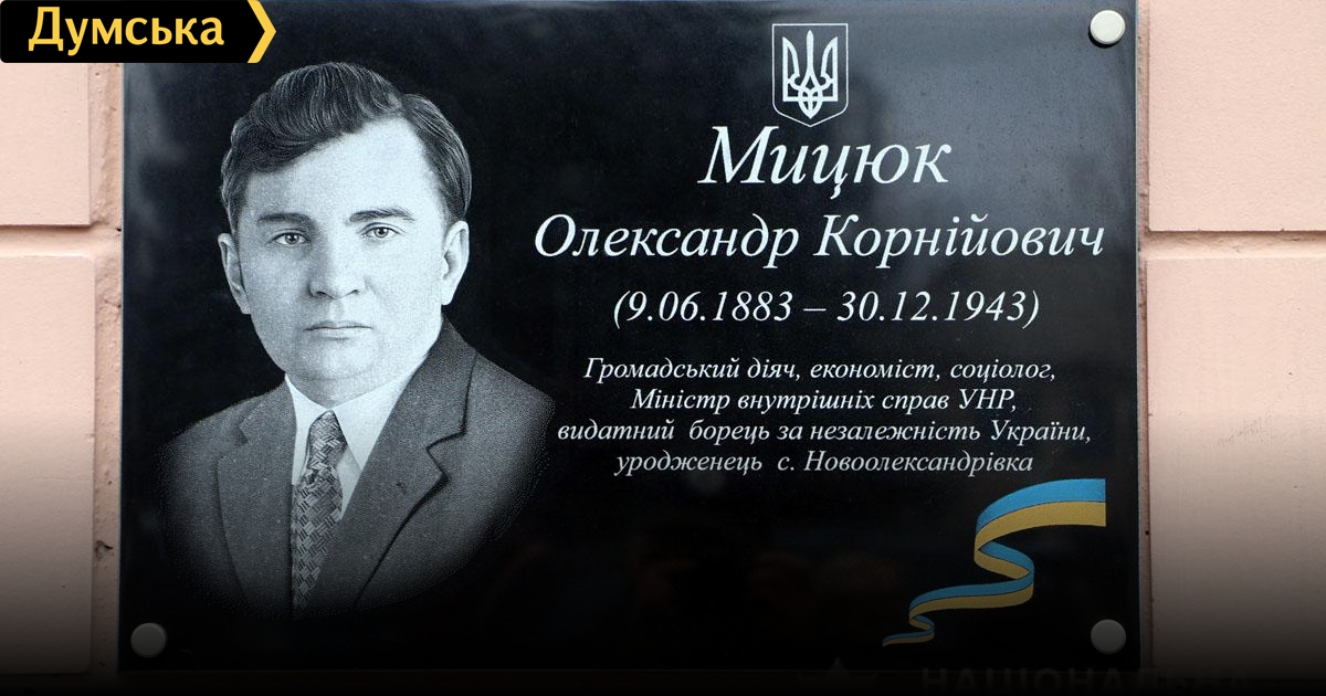 В Донецкой области открыли мемориальную доску первому министру внутренних дел УНРМемориальную доску Александру Мицюку — министру внутренних дел УНР, автору более 60 научных работ и борцу за независимость Украины — открыли в Донецкой области. Как сообщили в отделе коммуникации Нацполиции, мемориальная доска в память о первом министре, занимавшем эту должность в 1918-1919 годах, установлена на здании отделения полиции №1 Краматорского районного управления полиции в его родном поселке Александровка. «Пример Александра Мицюка – это свидетельство того, что украинская душа проявляется и в Донецкой области, и в Закарпатье, и в Одессе, и на территории северных регионов нашего государства, — отметил первый замглавы МВД Евгений Енин. — Из исторических сообщений мы видим, что еще 100 лет назад он ясно осознавал всю сущность московского большевистского режима. Мы должны знать, уважать своих героев и брать пример, потому что главное сражение за независимость еще впереди». По словам председателя ОО «Украинская инициатива» Александра Косенко, корни современных государственных институций были заложены во время первых освободительной борьбы 1917-1921 годов. Среди государственных деятелей того времени есть целая плеяда жителей Донецкой и Луганской областей. Александр Мицюк родился в 1883 году. Политический и государственный деятель являлся соратником многих известных представителей украинской революции. Занимал разные государственные должности, в том числе министра внутренних дел. Известный ученый – юрист, экономист, социолог. Преподавал в нескольких вузах, а также был ректором Украинского свободного университета в Праге. Умер в Чехии. СМЕРТЬ РОСІЙСЬКИМ ОКУПАНТАМ! Помітили помилку? Виділяйте слова з помилкою та натискайте control-enter |