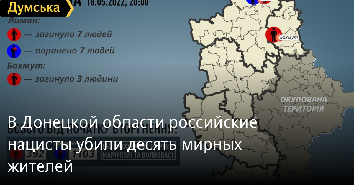 По его словам, российские нацисты убили семь человек в Лимане и трех в Бахмуте. Среди погибших известно о двух детях. Еще семь человек получили ранения.