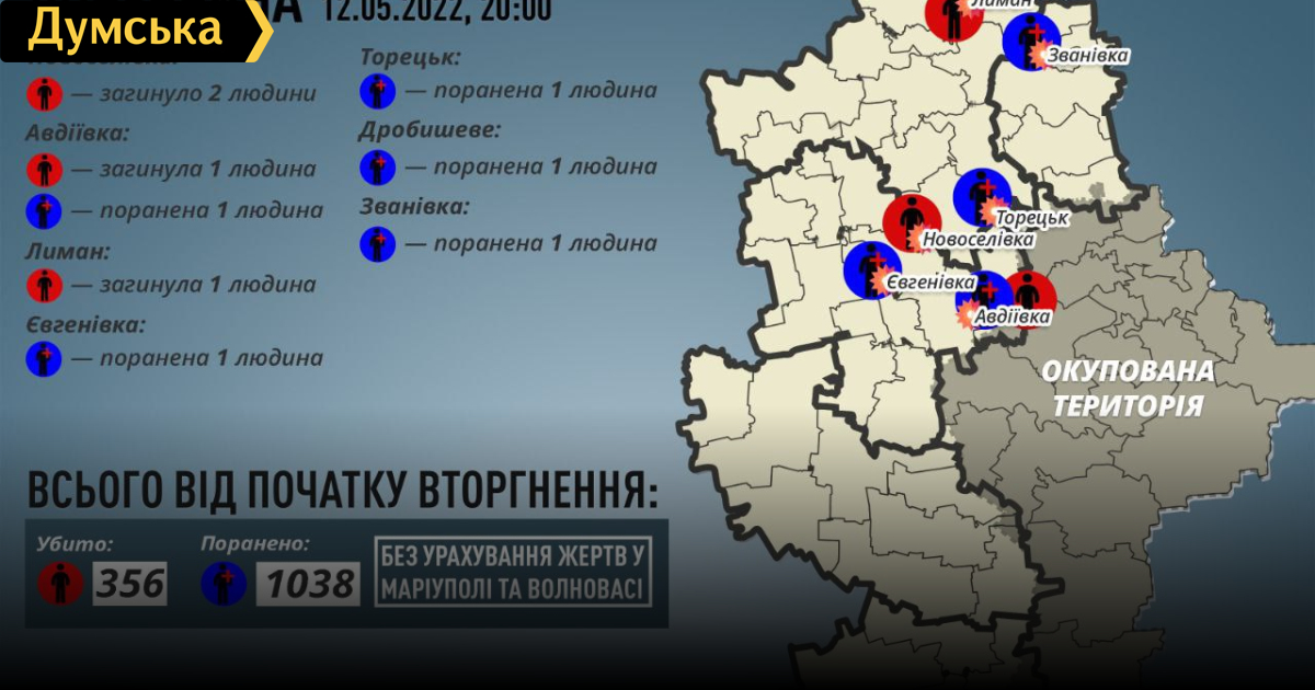 Четверо жителей Донецкой области погибли в результате вражеских обстрелов 12 мая. Еще пять человек получили ранения. Об этом сообщил глава Донецкой ОВА Павел Кириленко. По его словам, два человека погибли в Новоселовке, один в Авдеевке и один в Лимане. Глава ОВА также напомнил, что точное число погибших и пострадавших в Мариуполе и Волновахе установить невозможно. СМЕРТЬ РОСІЙСЬКИМ ОКУПАНТАМ! Помітили помилку? Виділяйте слова з помилкою та натискайте control-enter |