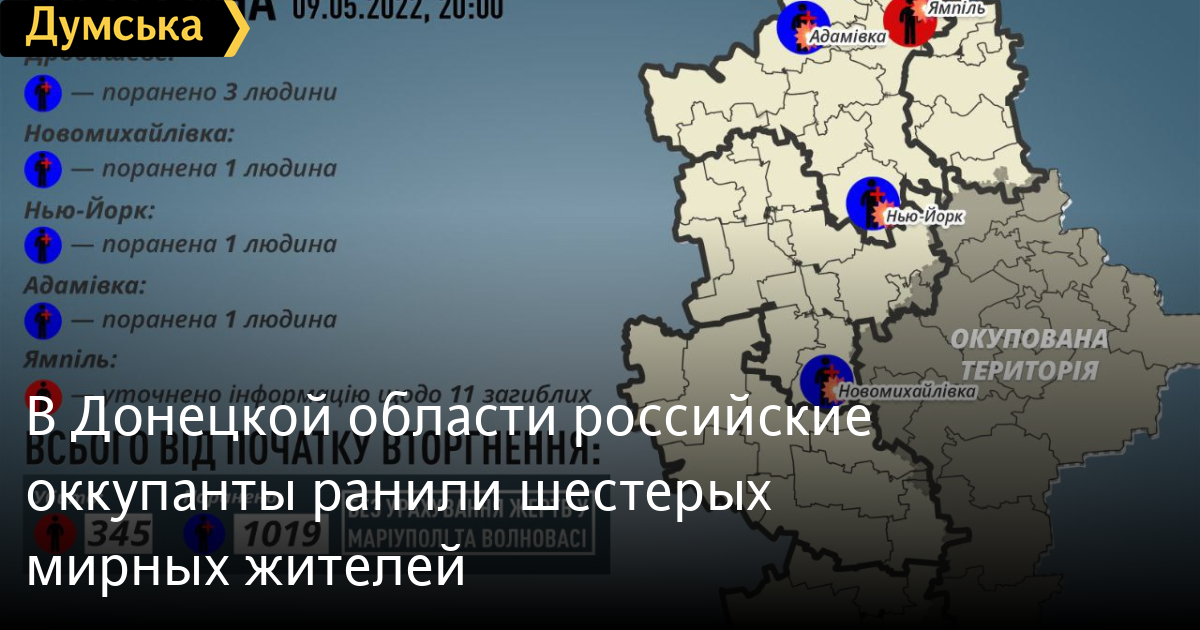 В Донецкой области в результате российских обстрелов 9 мая ранены 6 мирных жителей.