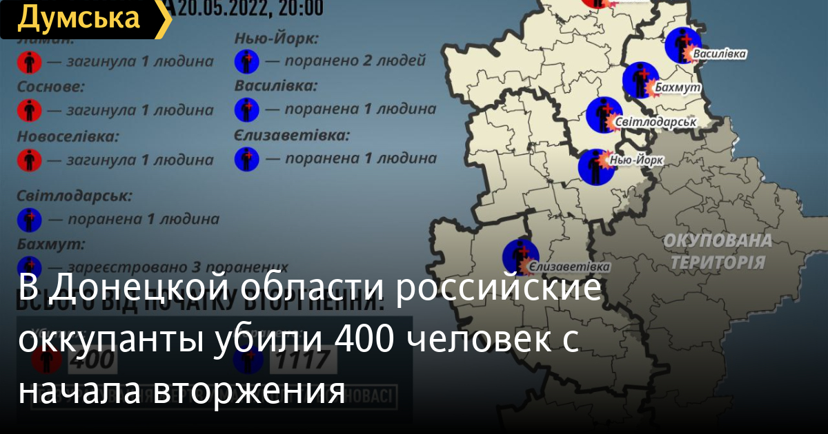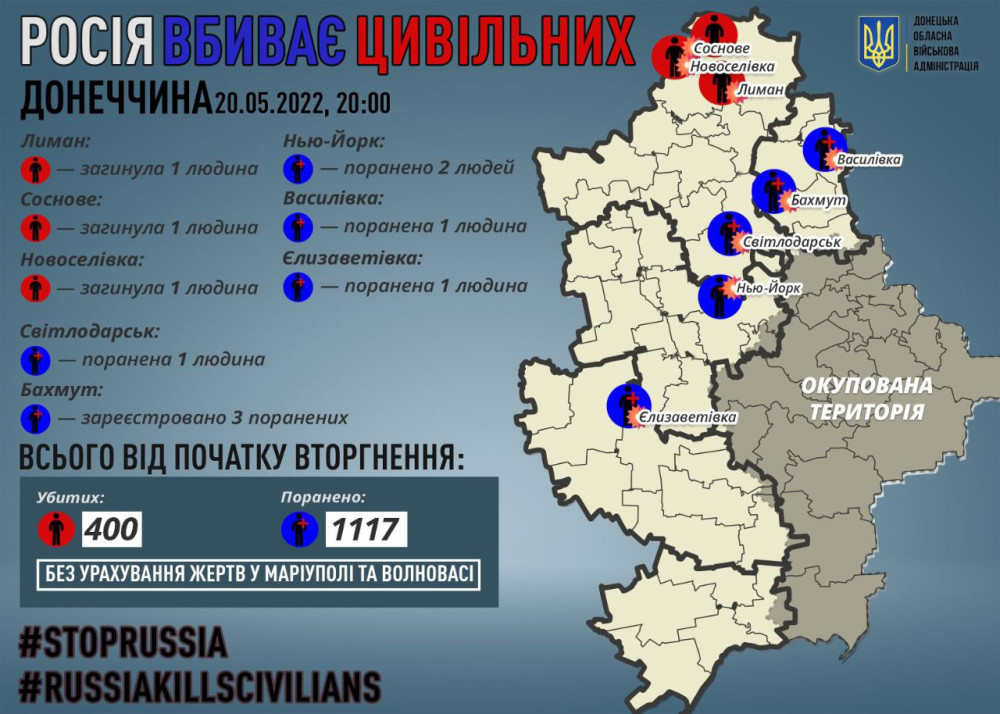 «За 20 мая россияне убили еще троих мирных жителей Донбасса, все трое – в Лиманской общине: в Лимане, Новоселовке и Сосновом. Всего с начала полномасштабного вторжения нам точно известно о 400 убитых россиянами гражданских в Донецкой области», — отметил глава ОВА.