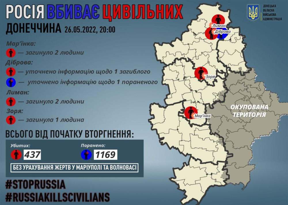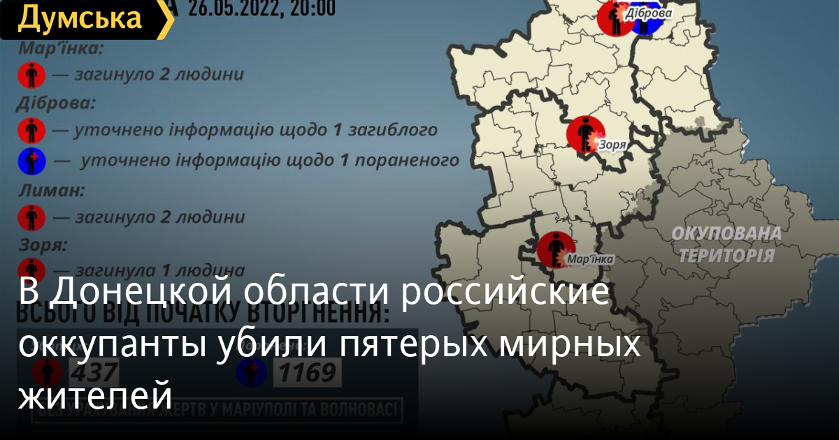 Российские оккупанты 26 мая убили пятерых мирных жителей Донецкой области.