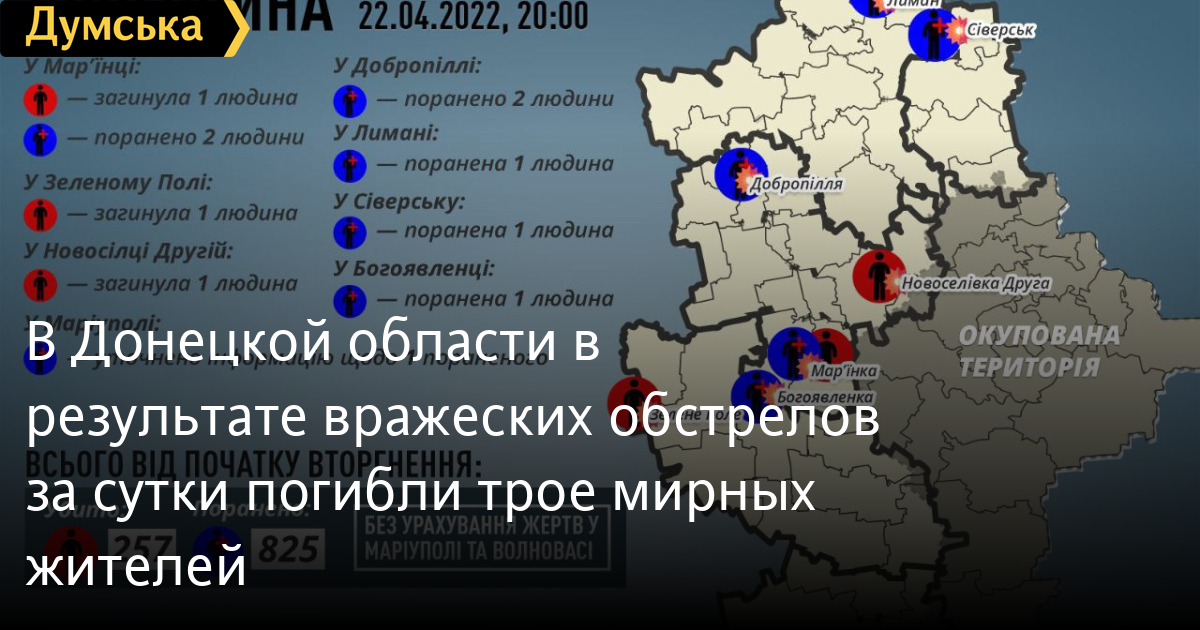 Трое мирных жителей Донецкой области погибли в результате вражеских обстрелов 22 апреля.
