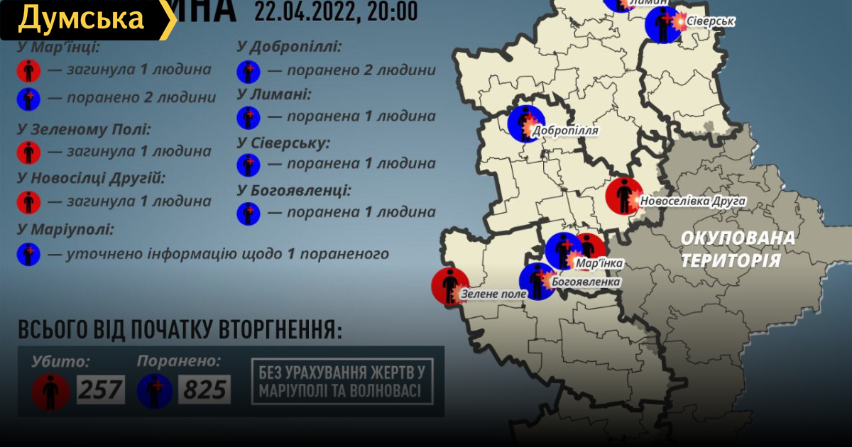 Как сообщает Донецкая ОВА, погибшие — жители Марьинки, Зеленого Поля и Новоселовки Второй. Кроме того, семеро жителей области получили ранения.