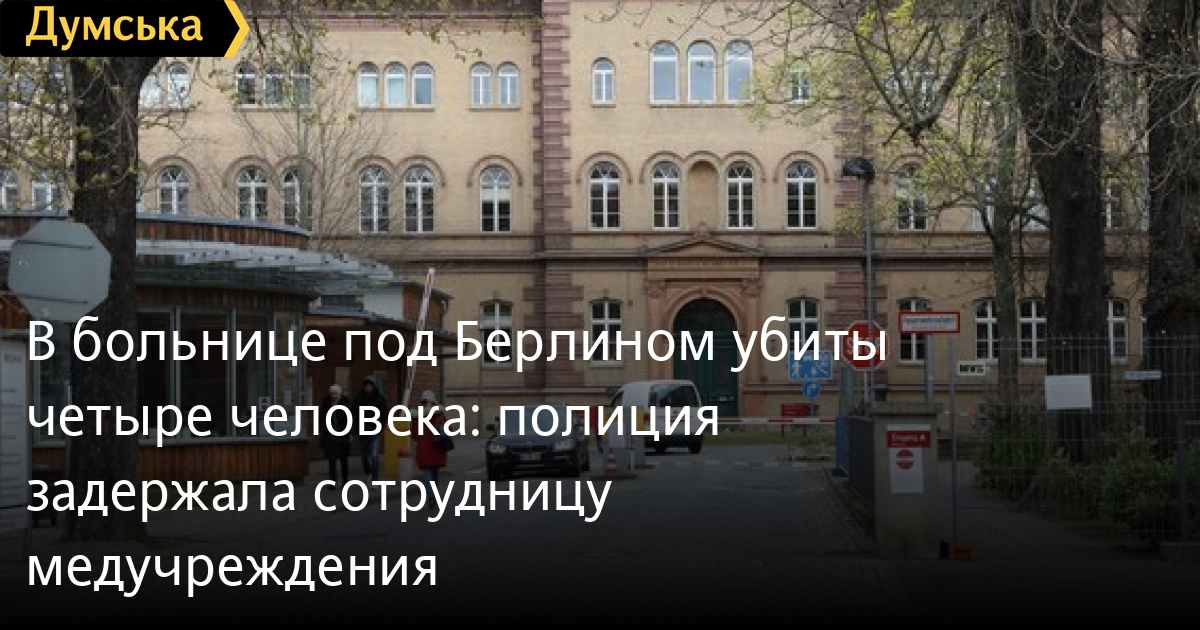 В больнице под Берлином убиты четыре человека: полиция задержала сотрудницу медучрежденияВ одной из больниц Потсдама, недалеко от Берлина, в ночь на 29 апреля, нашли тела четырех человек со следами насильственной смерти. Об этом сообщила полиция федеральной земли Бранденбург. Точную причину и обстоятельства гибели людей пока не выяснили. При этом правоохранители установили, что им умышленно нанесли смертельные травмы, предположительно, ножом. Оперативники начали расследование по факту происшествия. В частности, назначена судебно-медицинская экспертиза. Также на территории медучреждения работает прокуратура. По предварительной информации полицейских, помимо погибших, еще один человек был обнаружен с тяжелыми ранениями. Все жертвы находились в разных палатах больницы. Сейчас оперативники пытаются выйти на связь с их родственниками, чтобы уведомить о трагедии. По одной из версий правоохранителей, преступление могла совершить 51-летняя сотрудница медицинского учреждения. Подозреваемую задержали для выяснения обстоятельств. Мотивы предполагаемой убийцы пока не известны. Как передают СМИ, женщина якобы сама рассказала о том, что натворила, своему мужу, когда пришла домой, после чего об этом узнали оперативники. Полиция пока официально не подтвердила, что убитые и пострадавший были пациентами больницы, в которой над ними расправились. В то же время, по данным издания Potsdamer Neueste Nachrichten, жертвы проходили лечение в медицинском центре «Оберинхаус», где оказывают помощь людям с тяжелыми формами инвалидности. СМЕРТЬ РОССИЙСКИМ ОККУПАНТАМ! Заметили ошибку? Выделяйте слова с ошибкой и нажимайте control-enter Новости по этой теме: |
