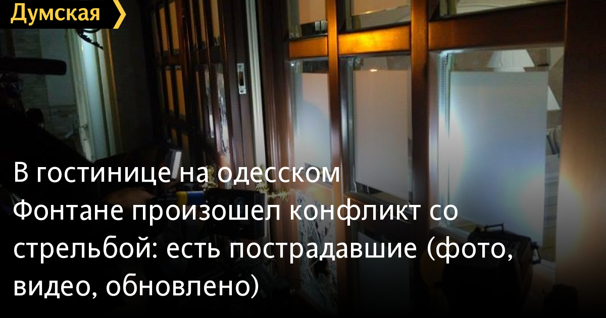 «По словам пресс-секретаря Нацполиции в Одесской области, Анастасии Якубовской, между тремя сторонами собственниками гостиницы давно возникла конфликтная ситуация егодня ночью третья сторона забаррикадировала отель. С внешней стороны остались две другие стороны, патрульные и охранная фирма. У одного мужчины оказалось помповое оружие, из которого он несколько раз выстрелил в воздух. Пострадавших нет. Как добавила Якубовская, на данный момент задержано 18 человек».