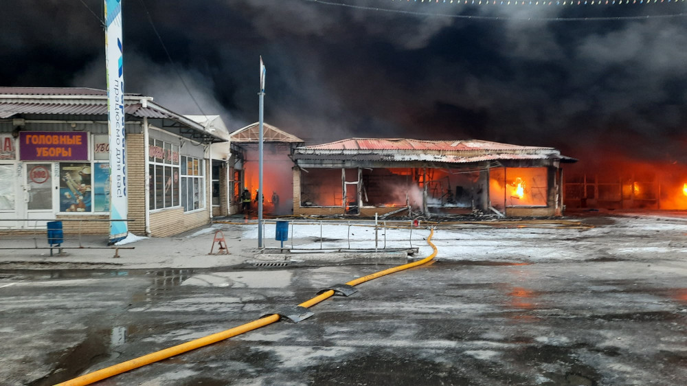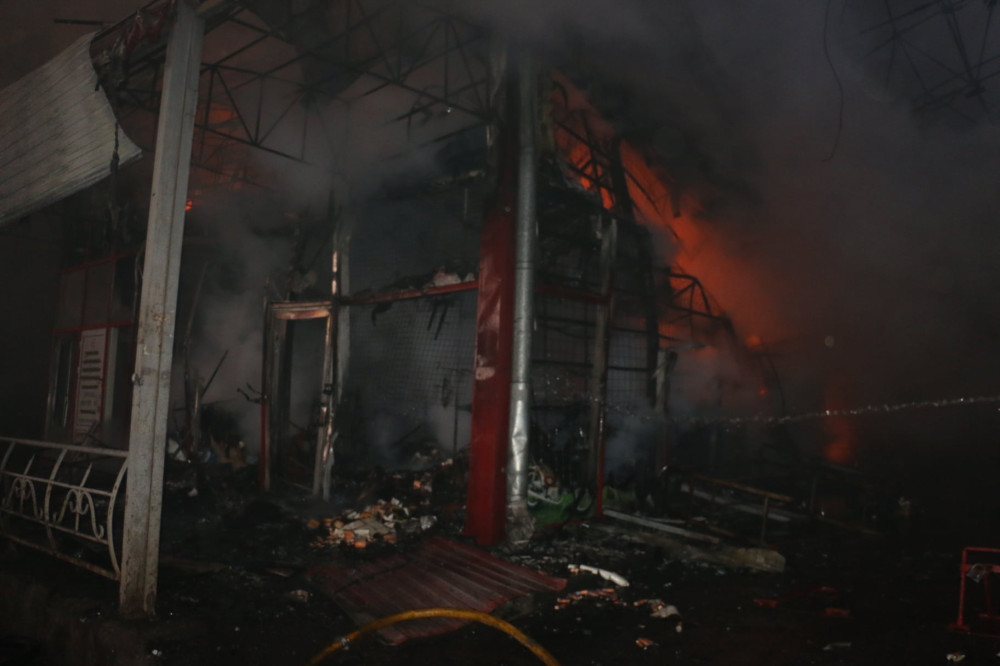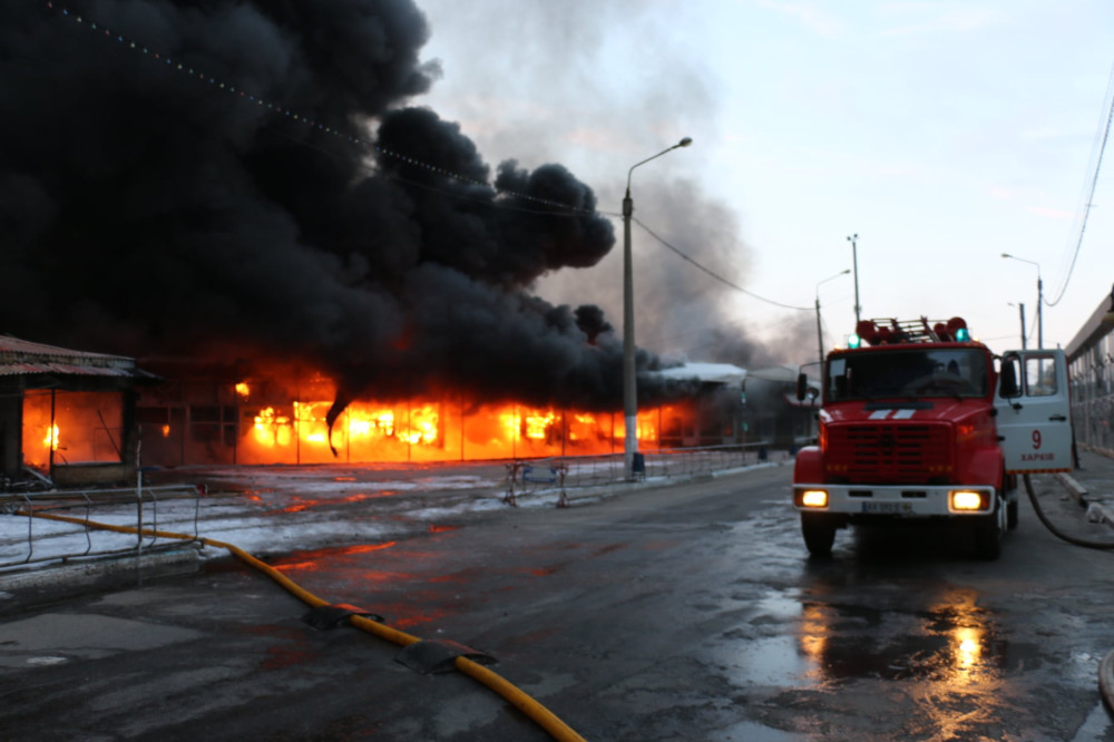 В результате обстрела загорелись торговые павильоны в разных местах одного из крупнейших рынков Восточной Европы — Барабашово, сообщают в ГСЧС.