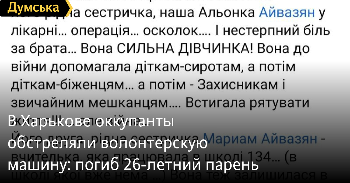 В районе парка Горького в городе Харьков враги открыли огонь по автомобилю организации Help Army. От тяжелого ранения погиб 26-летний волонтер.
