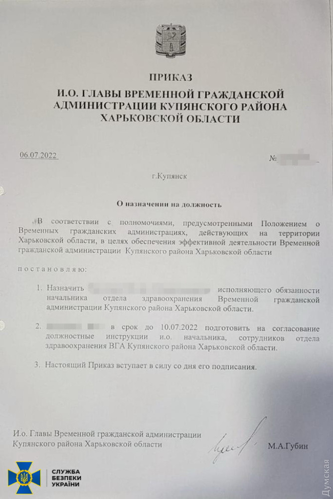 У СБУ повідомили, що раніше фігурант очолював міський відділ охорони здоров'я, а після окупації зголосився керувати «відділом охорони здоров'я військово-цивільної адміністрації Куп'янського району рф».