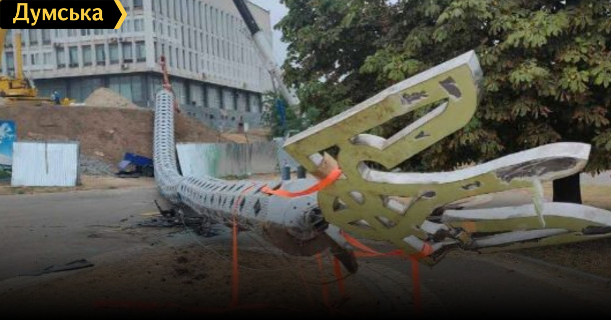 В Херсоне гигантский флагшток с трезубцем при установке рухнул на Lexus