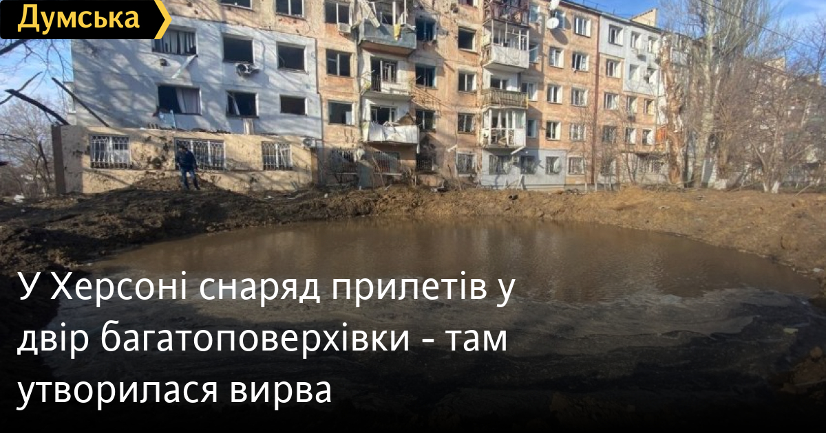 Російський снаряд прилетів у двір житлової багатоповерхівки в Херсоні. На місці прильоту утворилася вирва.