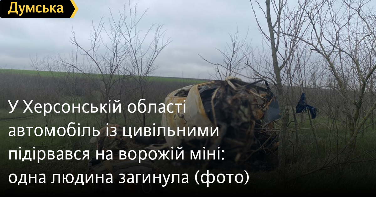 Одна людина загинула й одна дістала важке поранення внаслідок підриву цивільного автомобіля біля села Тягинка в Бериславському районі Херсонської області.