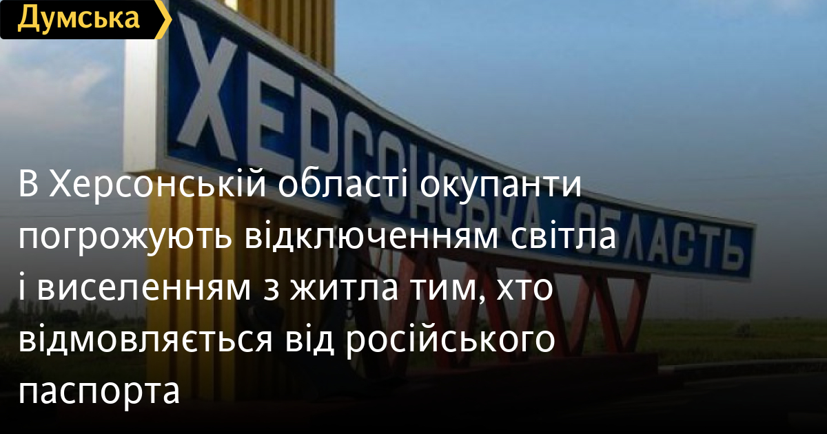 Відключенням від електропостачання або примусовим виселенням із власних осель погрожують окупанти мешканцям тимчасово захоплених територій Херсонської області, які відмовляються отримувати російський паспорт.