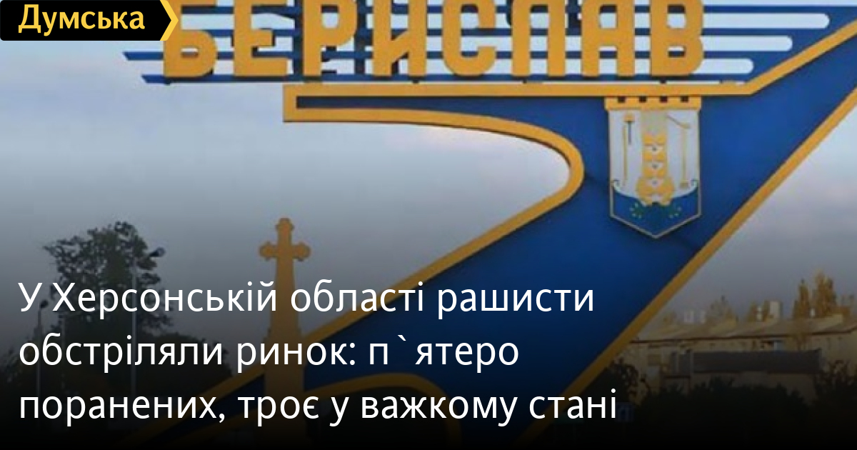 У Херсонській області рашисти обстріляли ринок: п`ятеро поранених, троє у важкому станіКілька вибухів сталося вранці 2 січня на ринку в Бериславі. Голова Херсонської обласної військової адміністрації Ярослав Янушевич заявив, що поранення дістали п'ятеро цивільних, троє з них у важкому стані. Імовірно, окупанти вели вогонь із танка з боку тимчасово окупованої Каховки на іншому березі Дніпра. СМЕРТЬ РОСІЙСЬКИМ ОКУПАНТАМ! Помітили помилку? Виділяйте слова з помилкою та натискайте control-enter |