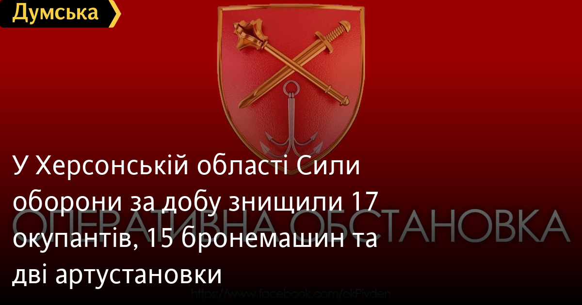У Херсонській області Сили оборони за добу знищили 17 окупантів, 15 бронемашин та дві артустановкиУкраїнські війська 15 листопада на Херсонщині знищили 17 рашистів. В Оперативному командуванні «Південь» також прозвітували про знищення 15 одиниць авто-бронетехніки та двох самохідних артилерійських установок, а також дрона-розвідника «Орлан-10». У Новій Каховці та Олешках наша артилерія знищила два склади з боєприпасами супротивника. У Чорному морі на чергуванні перебувають 14 ворожих кораблів, серед них чотири носії ракет «Калібр». СМЕРТЬ РОСІЙСЬКИМ ОКУПАНТАМ! Помітили помилку? Виділяйте слова з помилкою та натискайте control-enter |