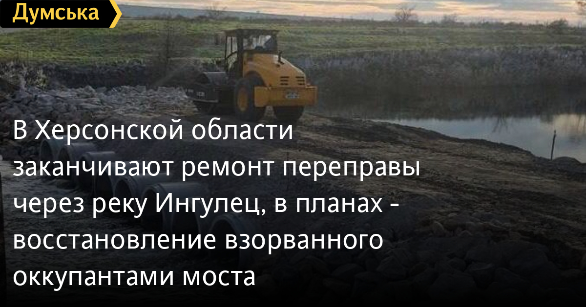 У Херсонській області закінчують ремонт переправи через річку Інгулець, у планах — відновлення підірваного окупантами мостуРемонт переправи через річку Інгулець, що з'єднує село Зарічне з Архангельським Високопільської громади на Херсонщині, підходить до завершення. Як повідомляє голова Херсонської облдержадміністрації Ярослав Янушевич, користуватися переправою можна буде вже за тиждень. За його словами, у відновлювальних роботах задіяно 20 спеціалістів і 15 одиниць техніки. У подальших планах — повноцінне відновлення мосту. Міст, нагадаємо, підірвали російські окупанти. Відтоді, у погану погоду, коли ґрунтові дороги стають непроїзними, жителі Зарічного не можуть виїхати з села. СМЕРТЬ РОСІЙСЬКИМ ОКУПАНТАМ! Помітили помилку? Виділяйте слова з помилкою та натискайте control-enter |