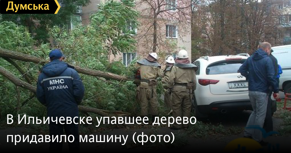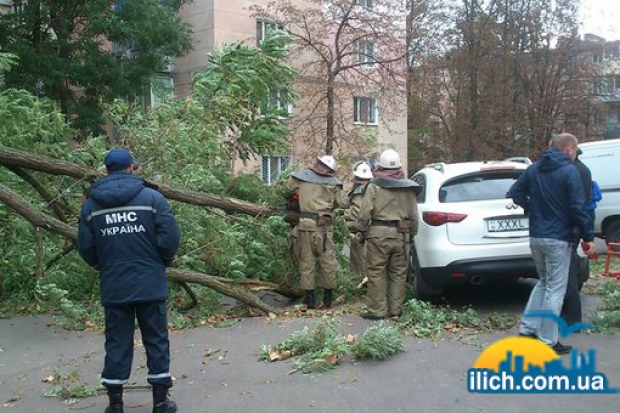 В городе Ильичевск Одесской области из-за непогоды дерево упало на автомобиль.